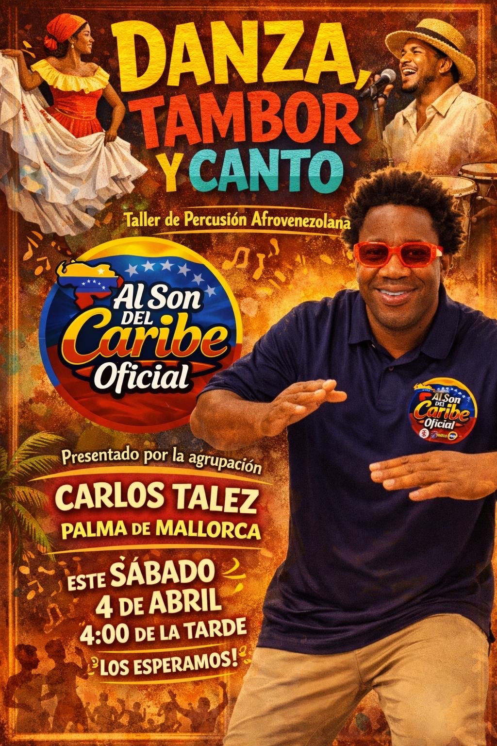 El taller está organizado por la agrupación Al Son del Caribe, reconocida por su labor en la difusión de ritmos caribeños y afrovenezolanos, y contará con la participación especial del cantante Carlos Tales, quien aportará su experiencia artística en una jornada llena de energía, aprendizaje y conexión cultural.